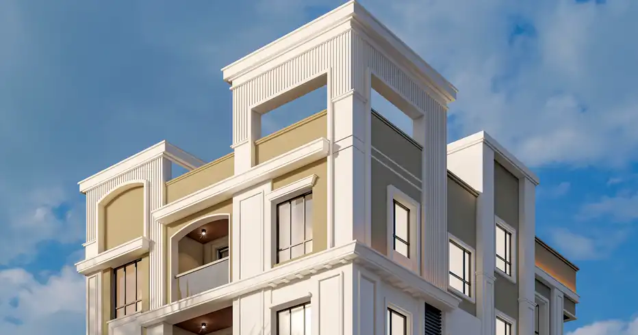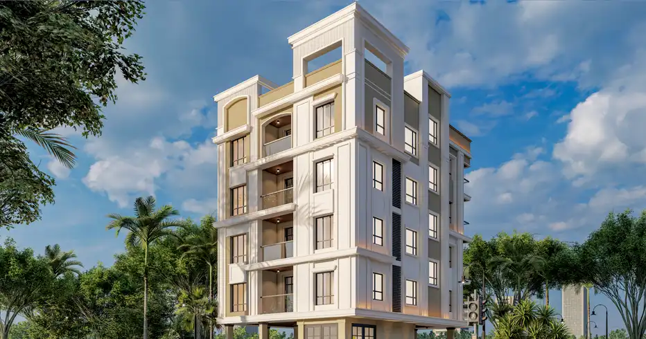 Ekdantaya Aashirbad rises with a silhouette that quietly commands attention. Inspired by timeless Gothic architecture, the building carries graceful arches, defined vertical lines, and a subtle grandeur that sets it apart from the everyday cityscape.